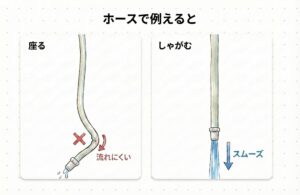 座る姿勢(洋式トイレ): 背筋を伸ばして座ると、股関節の角度は90度程度です。この状態では、恥骨直腸筋の力が完全には抜けきらず、直腸の折れ曲がり(ロック)が部分的に残ってしまいます。 つまり、「ホースが少し折れ曲がったまま、無理やり水を出そうとしている」状態です。これでは、強くいきまないと出ませんし、残便感も残りやすくなります。